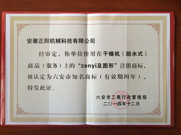 近日,安徽正陽機(jī)械科技有限公司“zenyi”牌干燥機(jī)(脫水式)商標(biāo)經(jīng)過申報(bào)、評選、公示等程序,正式被六安市工商行政管理局認(rèn)定為“六安市知名商標(biāo)”。這是公司全體員工共同努力的結(jié)果,是六安市工商行政管理局等政府職能部門親切關(guān)懷和大力支持的結(jié)果,標(biāo)志著安徽正陽機(jī)械科技有限公司在品牌化戰(zhàn)略發(fā)展道路上又前進(jìn)了一大步。