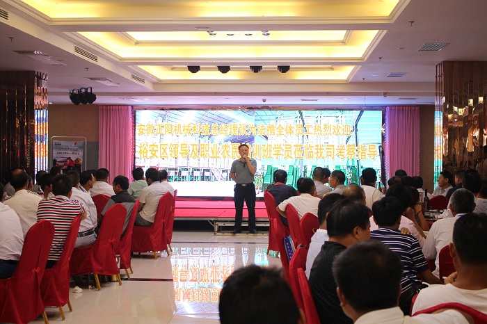 9月13日下午,裕安區(qū)職業(yè)農(nóng)民培訓(xùn)班一行人蒞臨我公司考察指導(dǎo),此次培訓(xùn)班由200多名種植大戶組成,場面十分熱鬧,公司張為法總經(jīng)理、許為青副總經(jīng)理、總經(jīng)理助理胡家冀、銷售部部長張杰等參與了此次接待活動,張為法總經(jīng)理代表安徽正陽機械科技有限公司表達了對于他們此次來訪的熱烈歡迎。